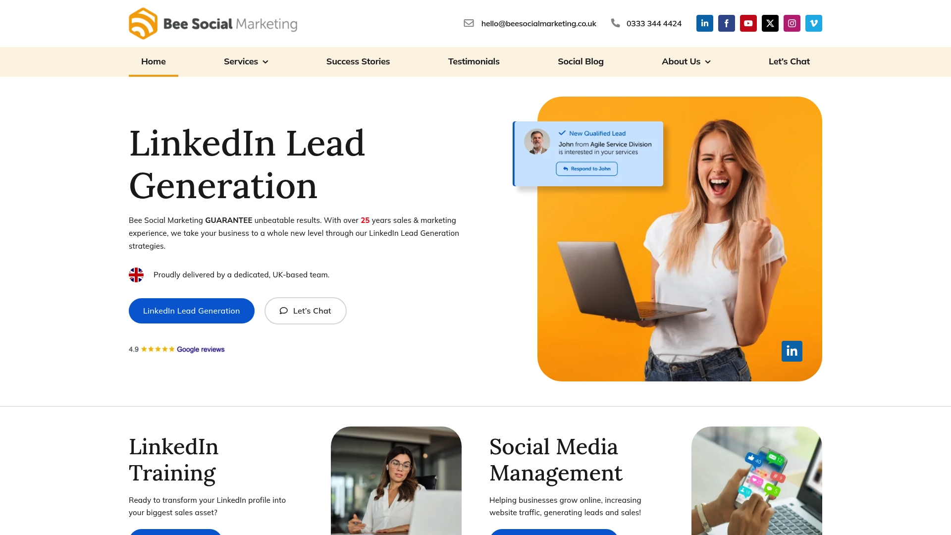 Bee Social Marketing is a UK based social media agency focused on LinkedIn lead generation and related services. Their experienced UK based team promises measurable outcomes and presents strong proof points for B2B sellers seeking direct sales impact.