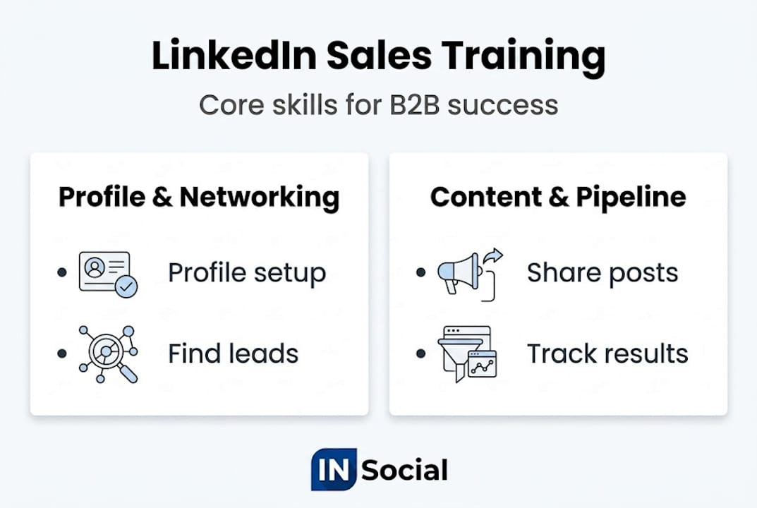 Effective training should cover profile optimisation, networking, messaging, content, and pipeline analytics. Profile, network, and analytics skills form the core foundation for lasting LinkedIn sales impact.