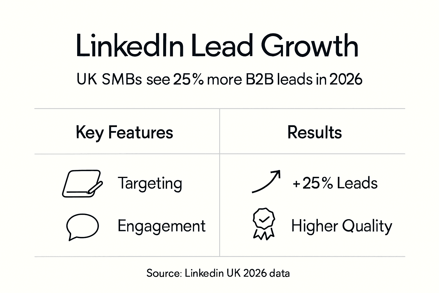 | LinkedIn dominates B2B lead generation | The platform delivers over 80% of social media B2B leads, offering unmatched professional targeting for UK SMBs. |